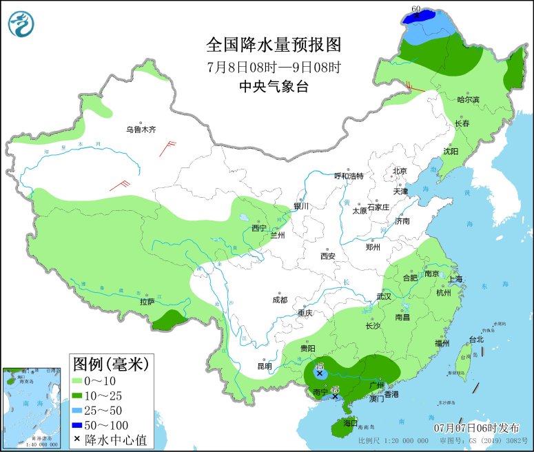 7月8日08時(shí)至9日08時(shí),內(nèi)蒙古東北部、黑龍江西部和東部、華南大部等地部分地區(qū)有中到大雨,其中,內(nèi)蒙古東北部、黑龍江西北部等地部分地區(qū)有暴雨(50~60毫米)。新疆沿天山地區(qū)和南疆盆地等地部分地區(qū)有4~6級風(fēng)。南海西南部海域?qū)⒂?~6級、陣風(fēng)7級的偏西風(fēng)。