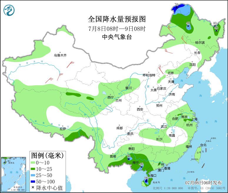 7月8日08時(shí)至9日08時(shí),內(nèi)蒙古東北部、黑龍江西部和東北部、云南南部、華南西部和南部等地部分地區(qū)有中到大雨,其中,內(nèi)蒙古東北部等地局地有暴雨(50~90毫米)。內(nèi)蒙古中東部、新疆沿天山地區(qū)和南疆盆地等地部分地區(qū)有4~6級(jí)風(fēng);南海南部海域有5~7級(jí)、陣風(fēng)8級(jí)的偏西風(fēng)。