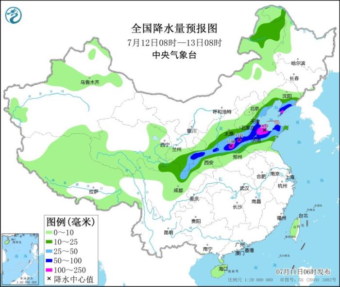 7月11日08時至12日08時,甘肅南部、陜西中北部、內(nèi)蒙古河套地區(qū)、西北地區(qū)東部、山西、河北中南部、北京南部、天津、山東中北部、河南西北部、四川盆地西北部等地有中到大雨,其中,甘肅東南部、內(nèi)蒙古河套地區(qū)、陜西北部、山西中北部、河北南部、山東中部和西北部等地的部分地區(qū)有暴雨或大暴雨(100~130毫米)。新疆南疆盆地部分地區(qū)有4~6級風。南海南部海域?qū)⒂?~6級、陣風7級的偏西到西南風。