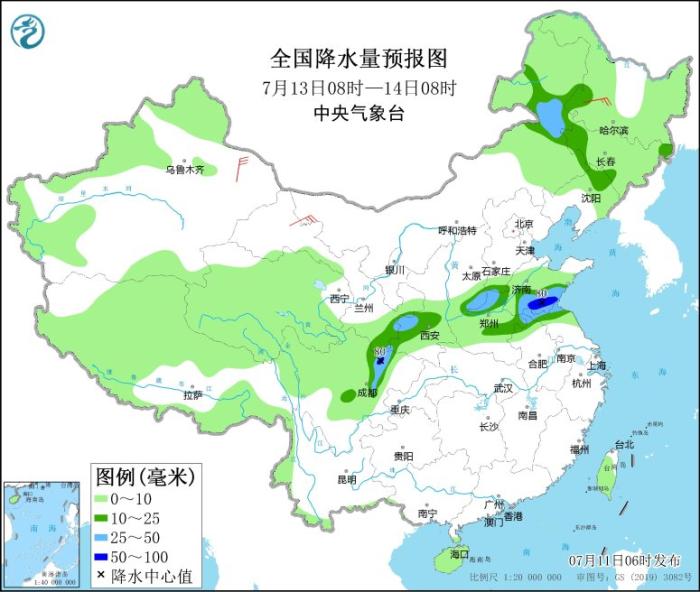 7月13日08時至14日08時,甘肅東南部、陜西關(guān)中地區(qū)、內(nèi)蒙古東北部、吉林西部、遼寧北部、山西南部、河北南部、河南北部和東部、山東中南部、蘇皖北部及四川盆地西北部等地的部分地區(qū)有中到大雨,其中,山東南部、四川盆地西北部等地局部地區(qū)有暴雨(50~80毫米)。黑龍江西南部、新疆東部等地部分地區(qū)有4~6級風。南海西南部海域?qū)⒂?~6級、陣風7級的西南風。