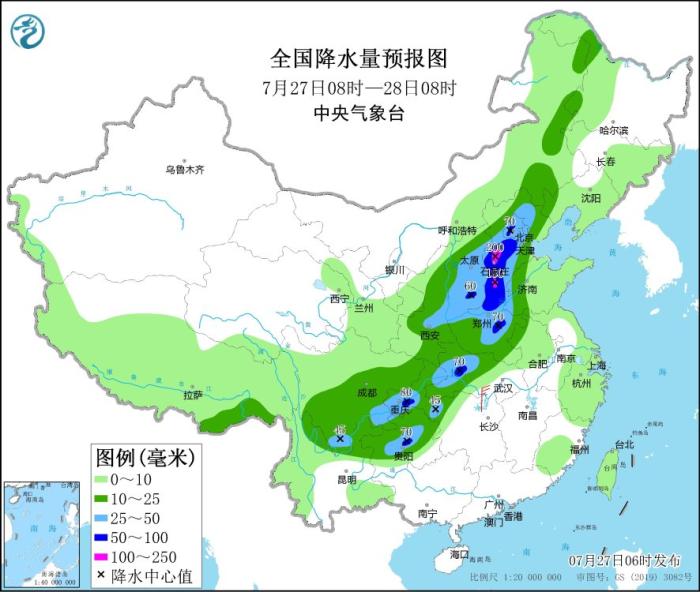 7月27日08時(shí)至28日08時(shí),內(nèi)蒙古東部、西北地區(qū)東部、華北、黃淮西部、江漢中西部、西南地區(qū)東部等地的部分地區(qū)有中到大雨,其中,河北中南部、河南北部和東部、湖北西部等地部分地區(qū)有暴雨,局地大暴雨(100~200毫米)。內(nèi)蒙古東部等地的部分地區(qū)有4~5級(jí)風(fēng)(見圖2)。