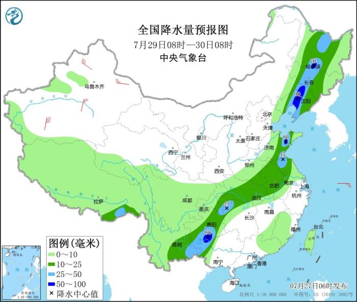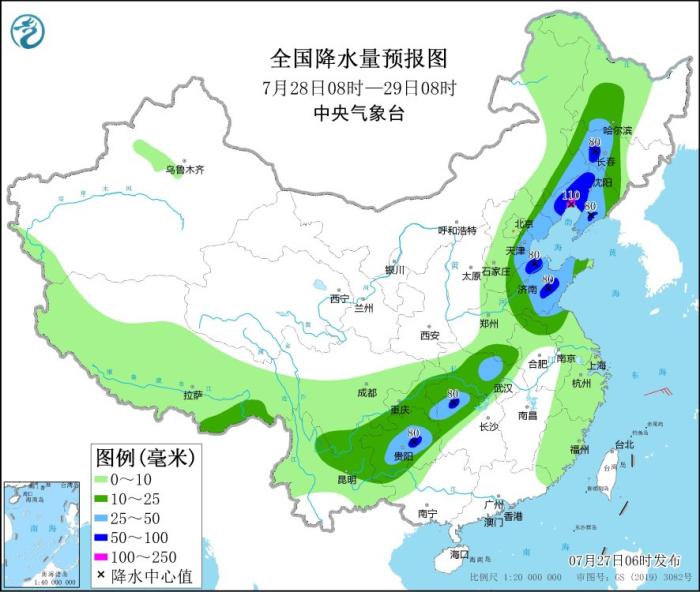 7月28日08時(shí)至29日08時(shí),內(nèi)蒙古東南部、東北地區(qū)西部和南部、華北東部、黃淮東部、江漢大部、湖南北部和西部、西南地區(qū)東南部等地部分地區(qū)有中到大雨,其中,遼寧中西部、山東中部、湖南北部、貴州中部等地部分地區(qū)有暴雨,局地大暴雨(100~110毫米)(見圖3)。