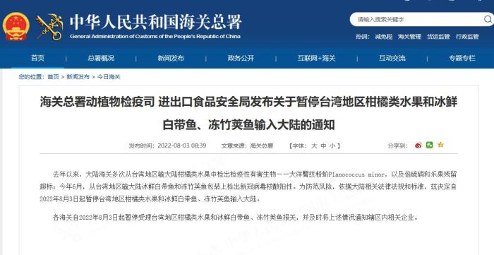 各海關自2022年8月3日起暫停受理臺灣地區(qū)柑橘類水果和冰鮮白帶魚、凍竹莢魚報關,并及時將上述情況通知轄區(qū)內(nèi)相關企業(yè)。(中新財經(jīng))
