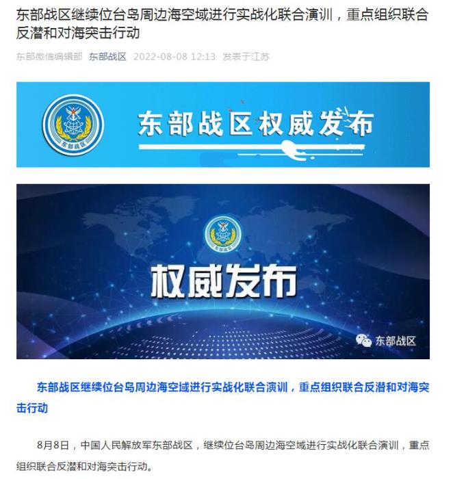 中新網(wǎng)8月8日電 據(jù)東部戰(zhàn)區(qū)微信公眾號消息,8月8日,中國人民解放軍東部戰(zhàn)區(qū)繼續(xù)位臺島周邊??沼蜻M行實戰(zhàn)化聯(lián)合演訓(xùn),重點組織聯(lián)合反潛和對海突擊行動。