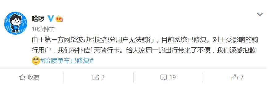 哈啰回應(yīng)單車崩了:系統(tǒng)已修復(fù) 補(bǔ)償1天騎行卡