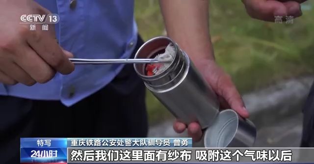 重慶鐵路公安處警犬隊(duì)馴導(dǎo)員 曾勇:這是我們訓(xùn)練用的乳化炸藥,然后我們這里面有紗布,吸附這個氣味后,就可以放在箱子里面,然后讓搜爆犬來進(jìn)行搜尋。如果它坐下或者臥下示警的話,就表示這個箱子里有危險品。