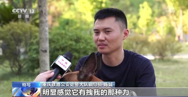 重慶鐵路公安處警犬隊(duì)馴導(dǎo)員 陳城:有一次我們出去找一個人的時候,在山林里搜救,我在行進(jìn)的途中不小心差點(diǎn)摔下去了,因?yàn)樽е?閃電的)警繩,明顯感覺它有拽我的那種力,把我拖上去的感覺挺感動的,當(dāng)時內(nèi)心有一顫。