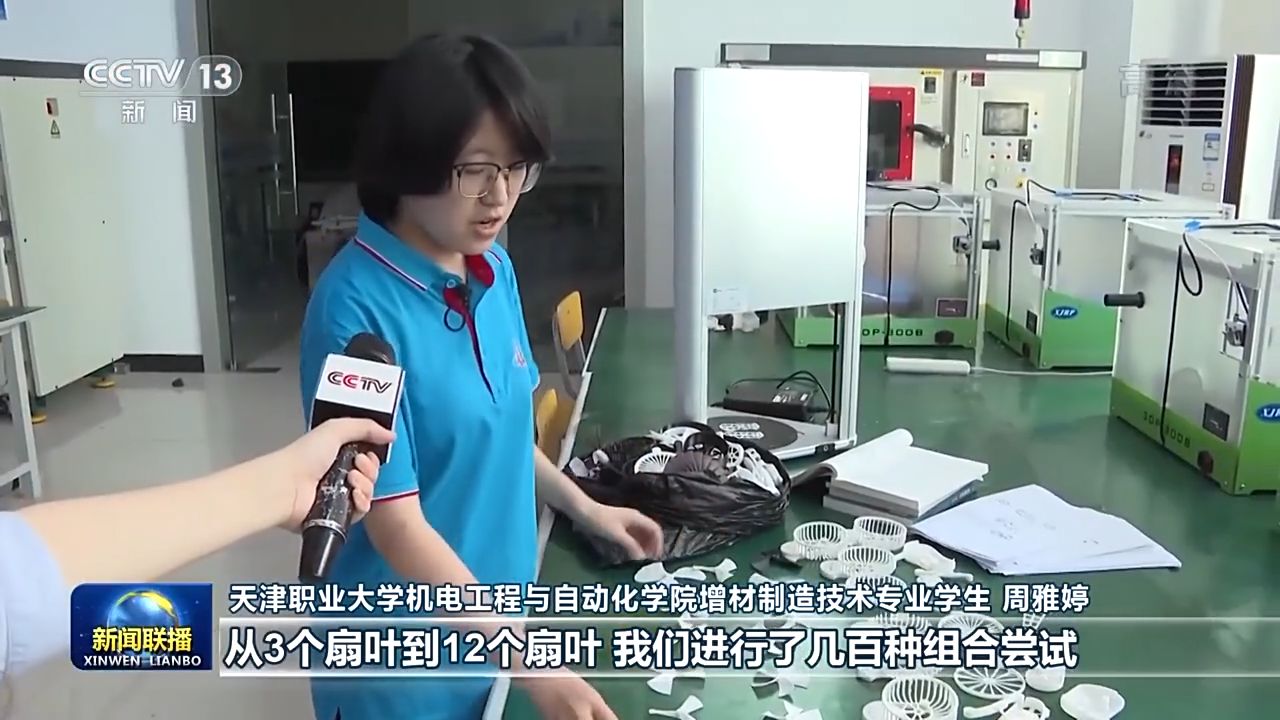天津職業(yè)大學(xué)機電工程與自動化學(xué)院增材制造技術(shù)專業(yè)學(xué)生 周雅婷:這些都是我們通過3D打印打印出來的,從3個扇葉到12個扇葉,我們進行了幾百種組合嘗試。如果差0.1毫米的話,可能會導(dǎo)致風(fēng)扇卡住。