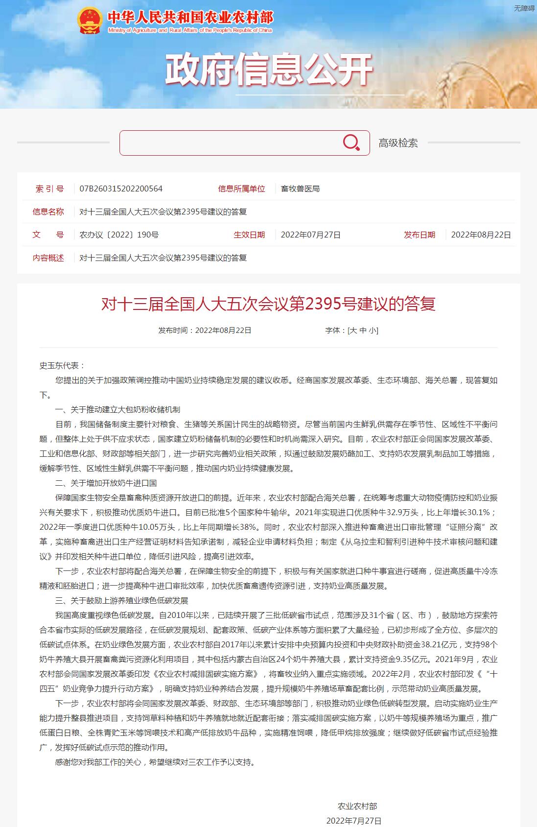 中新網(wǎng)8月23日電 農(nóng)業(yè)農(nóng)村部網(wǎng)站8月22日公布《對十三屆全國人大五次會議第2395號建議的答復(fù)》。關(guān)于推動建立大包奶粉收儲機制,農(nóng)業(yè)農(nóng)村部在答復(fù)中稱,目前,我國儲備制度主要針對糧食、生豬等關(guān)系國計民生的戰(zhàn)略物資。盡管當(dāng)前國內(nèi)生鮮乳供需存在季節(jié)性、區(qū)域性不平衡問題,但整體上處于供不應(yīng)求狀態(tài),國家建立奶粉儲備機制的必要性和時機尚需深入研究。目前,農(nóng)業(yè)農(nóng)村部正會同國家發(fā)展改革委、工業(yè)和信息化部、財政部等相關(guān)部門,進一步研究完善奶業(yè)相關(guān)政策,擬通過鼓勵發(fā)展奶酪加工、支持奶農(nóng)發(fā)展乳制品加工等措施,緩解季節(jié)性、區(qū)域性生鮮乳供需不平衡問題,推動國內(nèi)奶業(yè)持續(xù)健康發(fā)展。(中新財經(jīng))