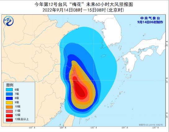 大風(fēng)預(yù)報(bào):9月14日08時(shí)至15日08時(shí),東海大部及釣魚島附近海域、黃海中南部海域、長江口區(qū)、杭州灣以及臺(tái)灣島北部沿海、福建北部沿海、山東南部沿海、浙江東部、上海、江蘇東部沿海和地區(qū)將有6-8級(jí)大風(fēng),陣風(fēng)9-11級(jí),其中東海中西部海域、浙江中北部沿海、上海沿海、江蘇東南部沿海、杭州灣、長江口區(qū)將有9-11級(jí)大風(fēng),陣風(fēng)12-14級(jí),“梅花”中心經(jīng)過的附近海面或地區(qū)的風(fēng)力有12-14級(jí),陣風(fēng)可達(dá)15-16級(jí)。