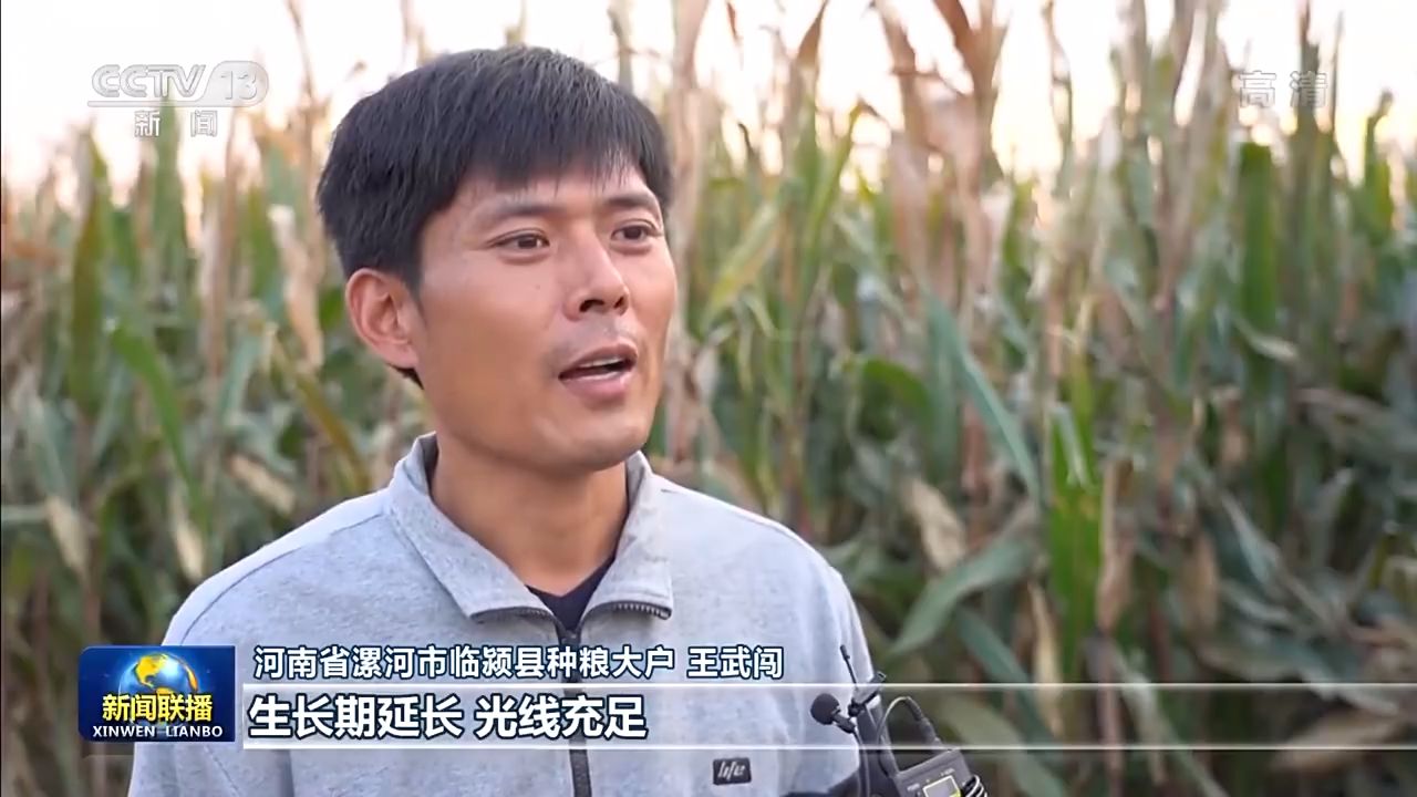 河南省漯河市臨潁縣種糧大戶 王武闖:比往年收獲晚一周左右,生長(zhǎng)期延長(zhǎng),光線充足,千粒重增加,每畝(比去年)增產(chǎn)50至60公斤左右。