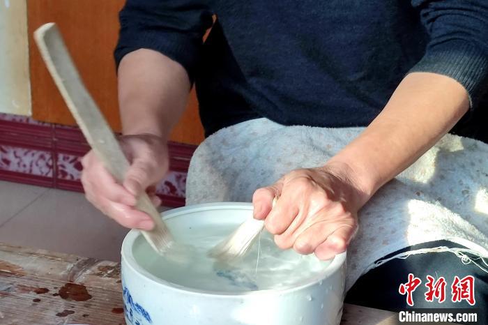 在水中反復梳洗毛筆頭是制筆的重要環(huán)節(jié)。 吳冠標 攝