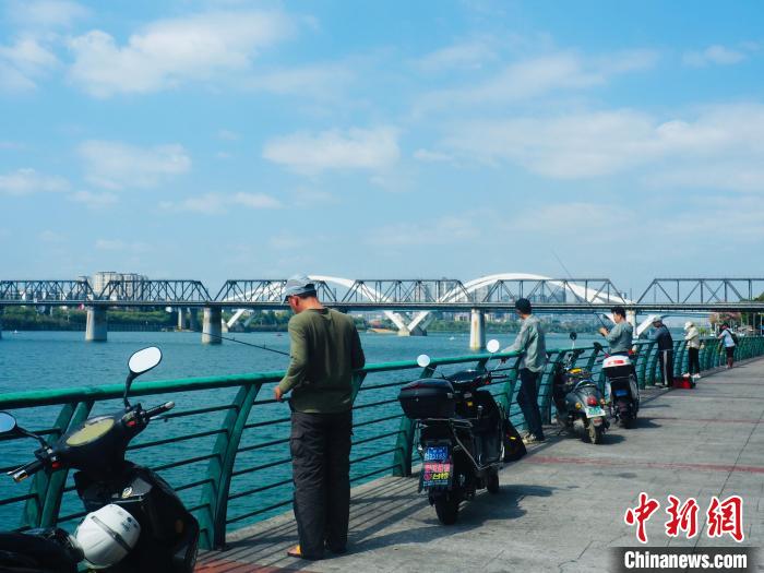 入秋,碧水藍天相互映襯,廣西柳州市的市民在柳江河的河岸上釣魚休閑。 李嬌陽 攝