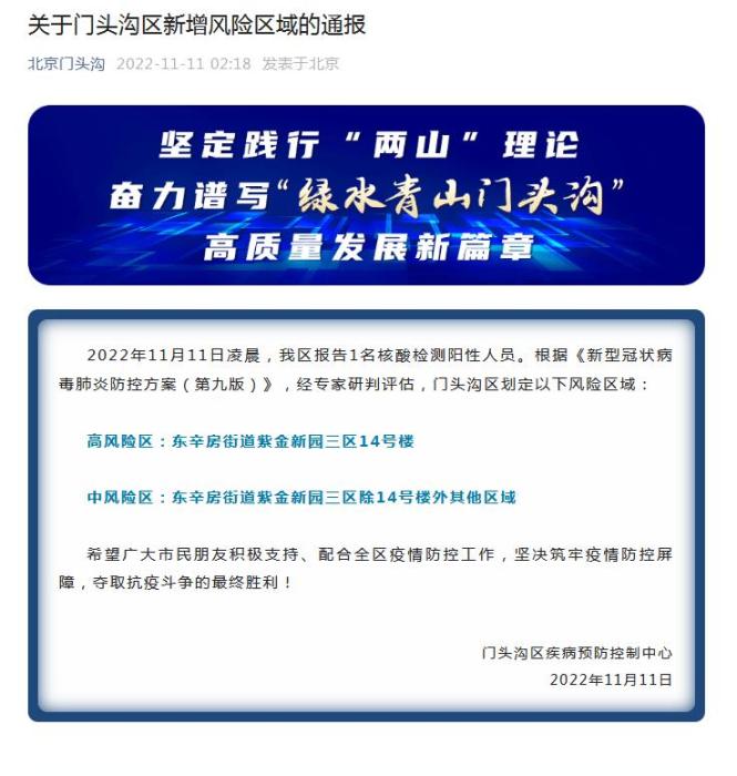中新網11月11日電 據“北京門頭溝”微信公眾號消息,北京市門頭溝區(qū)疾病預防控制中心11日發(fā)布通報稱,2022年11月11日凌晨,門頭溝區(qū)報告1名核酸檢測陽性人員。根據《新型冠狀病毒肺炎防控方案(第九版)》,經專家研判評估,門頭溝區(qū)劃定以下風險區(qū)域: