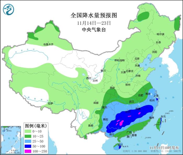 未來10天(11月14-23日),江南大部、華南西部及貴州等地累計降水量有25~40毫米,其中江南中南部及廣西中北部等地部分地區(qū)有50~80毫米、局部100毫米以上;上述地區(qū)降水量較常年同期偏多3~6成,局地偏多1倍以上;其余地區(qū)降水接近常年或偏少。