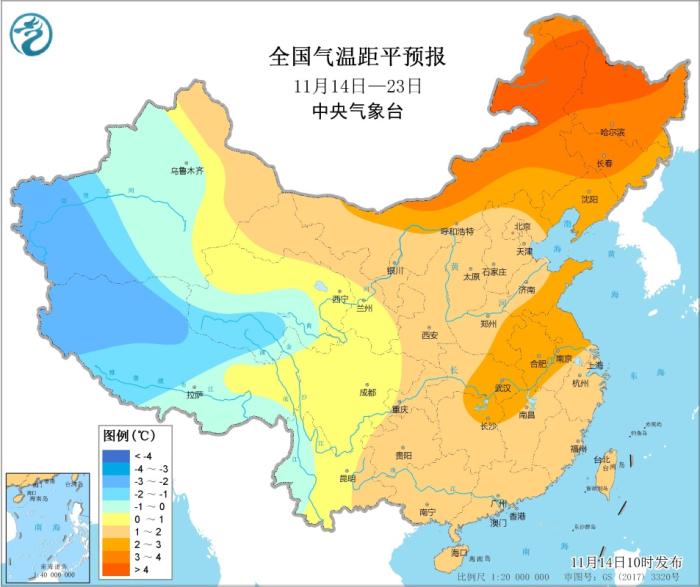 中新網(wǎng)11月14日電 據(jù)中央氣象臺網(wǎng)站消息,未來10天(11月14-23日),除新疆西部、青藏高原大部等地平均氣溫較常年同期偏低1~2℃,中東部大部地區(qū)偏高1~2℃,內(nèi)蒙古東部、東北地區(qū)中北部偏高3~4℃。未來10天,江南大部、華南西部及貴州等地累計降水量有25~40毫米,其中江南中南部及廣西中北部等地部分地區(qū)有50~80毫米、局部100毫米以上;上述地區(qū)降水量較常年同期偏多3~6成,局地偏多1倍以上;其余地區(qū)降水接近常年或偏少。