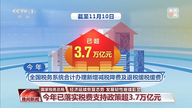 國家稅務(wù)總局今天公布最新數(shù)據(jù),截至11月10日,今年全國稅務(wù)系統(tǒng)合計(jì)辦理新增減稅降費(fèi)及退稅緩稅緩費(fèi)已超3.7萬億元,各項(xiàng)稅費(fèi)支持政策有效減輕了企業(yè)負(fù)擔(dān),增強(qiáng)了企業(yè)發(fā)展動(dòng)能。
