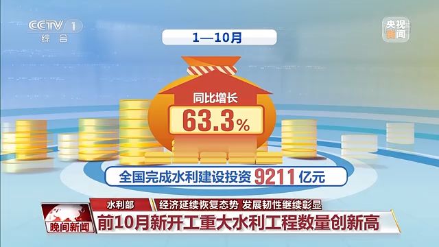 1—10月,全國完成水利建設(shè)投資9211億元,同比增長63.3%;較9月底增加投資975億元。