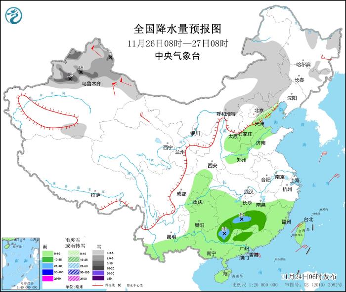 11月26日08時至27日08時,內(nèi)蒙古東部、新疆北疆大部等地部分地區(qū)有小到中雪,其中,新疆沿天山地區(qū)和伊犁河谷等地部分地區(qū)有大到暴雪(10~19毫米)。華北中南部、江南中西部和南部、四川東部、重慶大部、貴州大部、云南南部、華南、臺灣島等地部分地區(qū)有小到中雨,其中,湖南南部、廣西東北部等地部分地區(qū)有大雨(25~30毫米)。黑龍江東北部、新疆北疆北部、甘肅河西等地部分地區(qū)有4~6級風(fēng),其中,新疆東部部分地區(qū)有8~9級風(fēng)(見圖3)。