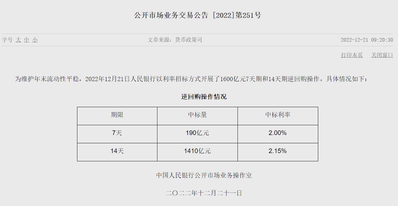 中新網(wǎng)12月21日電 據(jù)央行官網(wǎng)消息,為維護(hù)年末流動(dòng)性平穩(wěn),2022年12月21日人民銀行以利率招標(biāo)方式開展了1600億元7天期和14天期逆回購操作。中標(biāo)利率分別為2.00%和2.15%。(中新財(cái)經(jīng))