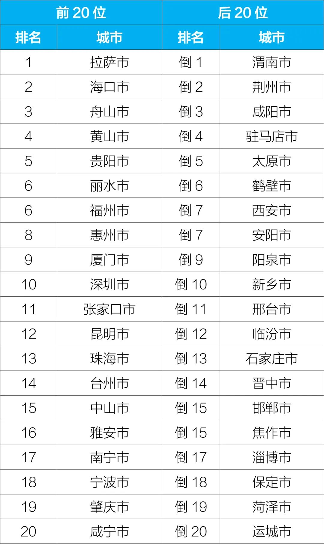 1—11月,168個重點城市中,拉薩、??诤椭凵绞械瘸鞘锌諝赓|(zhì)量相對較好(從第1名至第20名);渭南、荊州和咸陽市等城市空氣質(zhì)量相對較差(從倒數(shù)第1名至倒數(shù)第20名),見附表2。
