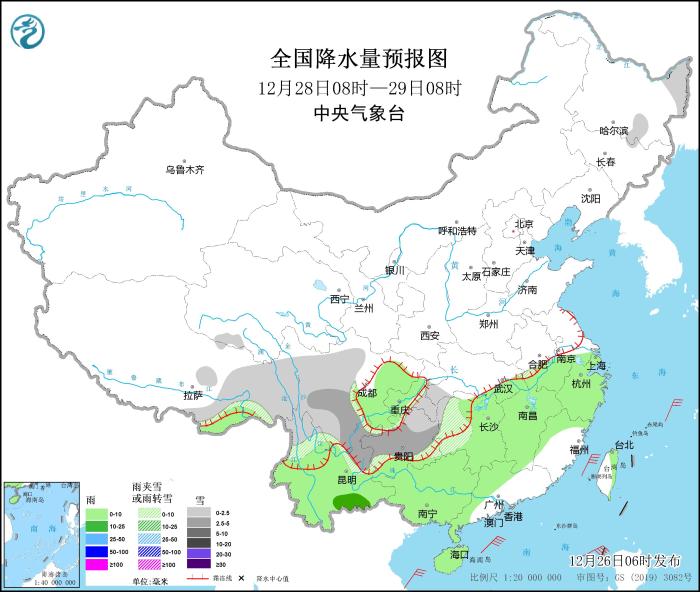 26日夜間至29日,西南地區(qū)、江南、華南等地將出現(xiàn)一次雨雪天氣過程,其中,西藏東南部、云南北部、川西高原、重慶東南部、貴州、湖南西部和北部、湖北西部、安徽南部、浙江西北部等地有小到中雪或雨夾雪,貴州中部和東部、湖南西部局地大到暴雪,貴州西部局地有凍雨;四川盆地、云南中南部、湖南南部、江西大部、浙江大部、福建北部以及廣西、廣東北部等地有小雨,局地中雨;主要降水時(shí)段為27日至28日。