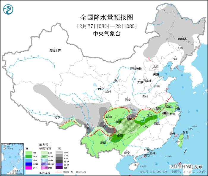 12月27日08時(shí)至28日08時(shí),內(nèi)蒙古東部、黑龍江和吉林大部、西藏東部、湖北西部、湖南西部、貴州中北部、重慶東南部、川西高原、云南北部以及安徽大別山區(qū)和皖南山區(qū)等地部分地區(qū)有小到中雪,其中,安徽皖南山區(qū)、湖北西南部、川西高原南部、重慶東南部、貴州西北部、云南北部等地部分地區(qū)有大到暴雪(10~15毫米)。湖北中東部、湖南中東部、安徽南部、江蘇南部、浙江北部、江西西北部、廣西中西部、云南中南部、臺(tái)灣島等地部分地區(qū)有小到中雨。內(nèi)蒙古中部、河北北部部分地區(qū)有4~5級(jí)風(fēng)。東海南部海域、臺(tái)灣海峽、巴士海峽、南海大部海域、北部灣將有6~7級(jí)、陣風(fēng)8級(jí)的偏北或東北風(fēng),其中臺(tái)灣海峽、南海東北部的部分海域風(fēng)力可達(dá)8級(jí)、陣風(fēng)9級(jí)(見圖2)。