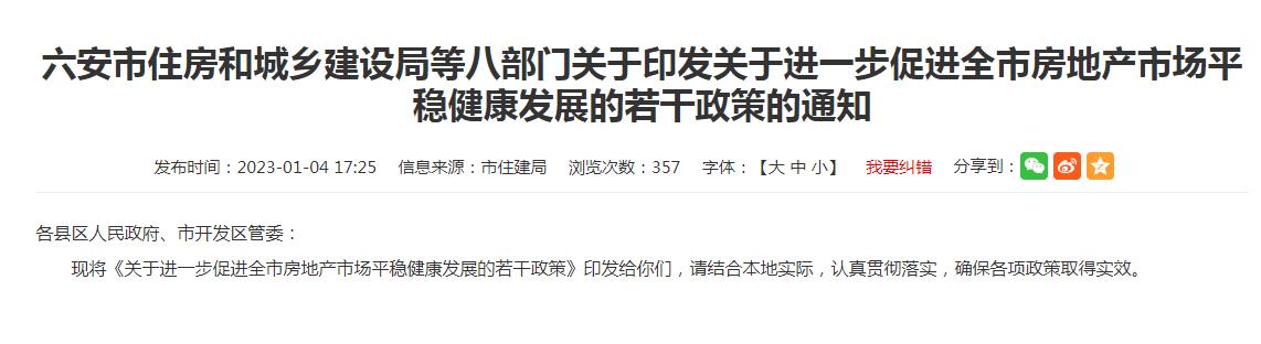 中新網(wǎng)1月5日電 據(jù)安徽省六安市住房和城鄉(xiāng)建設(shè)局網(wǎng)站消息,近日,六安市住房和城鄉(xiāng)建設(shè)局等八部門印發(fā)《關(guān)于進(jìn)一步促進(jìn)全市房地產(chǎn)市場平穩(wěn)健康發(fā)展的若干政策》。