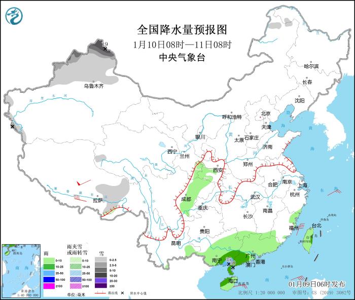 1月9日08時(shí)至10日08時(shí),新疆北部和西部山區(qū)、西藏西部等地部分地區(qū)有小到中雪,其中,新疆北疆北部、西藏西部局地有大到暴雪(10~18毫米)。江南中南部、華南大部、臺(tái)灣島等地部分地區(qū)有小到中雨,其中,廣東東北部和西南部沿海、海南島北部等地局地有大雨(25~45毫米)。西藏中西部等地部分地區(qū)有5~7級(jí)風(fēng)(見圖1)。