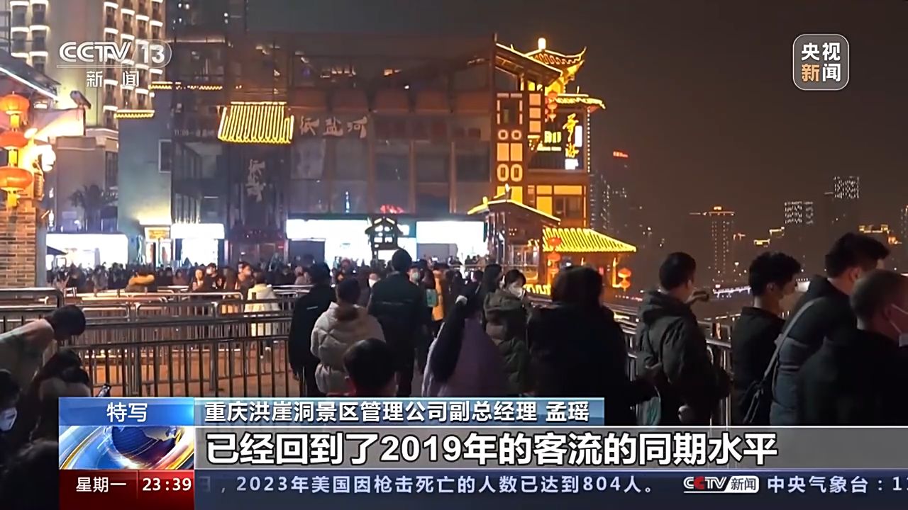 重慶洪崖洞景區(qū)管理公司副總經(jīng)理 孟瑤:本來按照我們的預(yù)估,可能會(huì)在今年的二到三月份,游客量會(huì)有一個(gè)明顯的回升。元旦的第一天和第二天,我們的客流分別已經(jīng)達(dá)到了6.4萬和6.2萬,已經(jīng)回到了2019年的客流的同期水平,甚至已經(jīng)超過了17%。