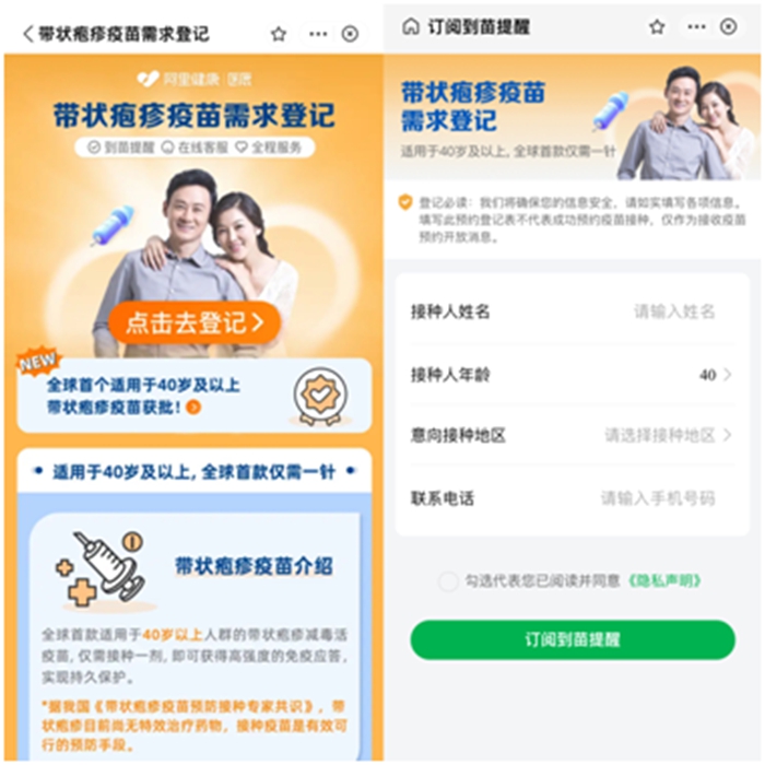 2日,阿里健康上線國產(chǎn)帶狀皰疹疫苗接種需求登記服務,年齡40歲及以上、有接種需求的用戶可以在線填寫信息,訂閱到苗提醒。