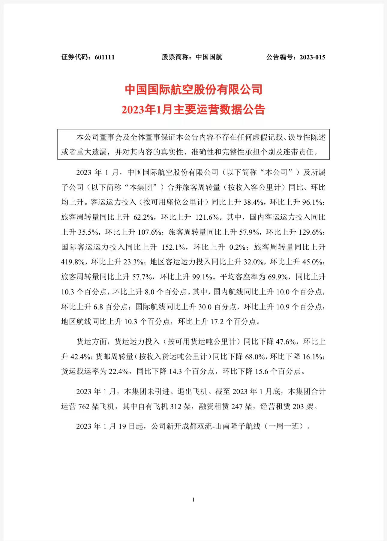 公告顯示,2023年1月,中國(guó)國(guó)航及所屬子公司合并旅客周轉(zhuǎn)量(按收入客公里計(jì))同比、環(huán)比均上升。客運(yùn)運(yùn)力投入(按可用座位公里計(jì))同比上升38.4%,環(huán)比上升96.1%;旅客周轉(zhuǎn)量同比上升62.2%,環(huán)比上升121.6%。