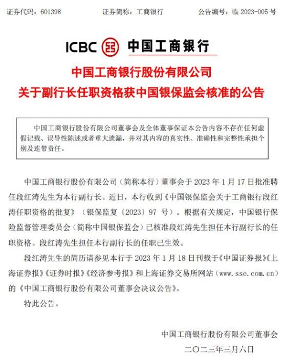 工商銀行6日發(fā)布公告稱(chēng),董事會(huì)于2023年1月17日批準(zhǔn)聘任段紅濤為副行長(zhǎng)。近日,工商銀行收到《中國(guó)銀保監(jiān)會(huì)關(guān)于工商銀行段紅濤任職資格的批復(fù)》。根據(jù)有關(guān)規(guī)定,中國(guó)銀保監(jiān)會(huì)已核準(zhǔn)段紅濤擔(dān)任工商銀行副行長(zhǎng)的任職資格。段紅濤先生擔(dān)任工商銀行副行長(zhǎng)的任職已生效。