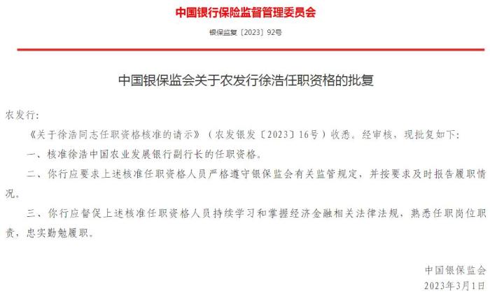 中國(guó)銀保監(jiān)會(huì)6日公布的《中國(guó)銀保監(jiān)會(huì)關(guān)于農(nóng)發(fā)行徐浩任職資格的批復(fù)》顯示,核準(zhǔn)徐浩中國(guó)農(nóng)業(yè)發(fā)展銀行副行長(zhǎng)的任職資格。(中新財(cái)經(jīng))