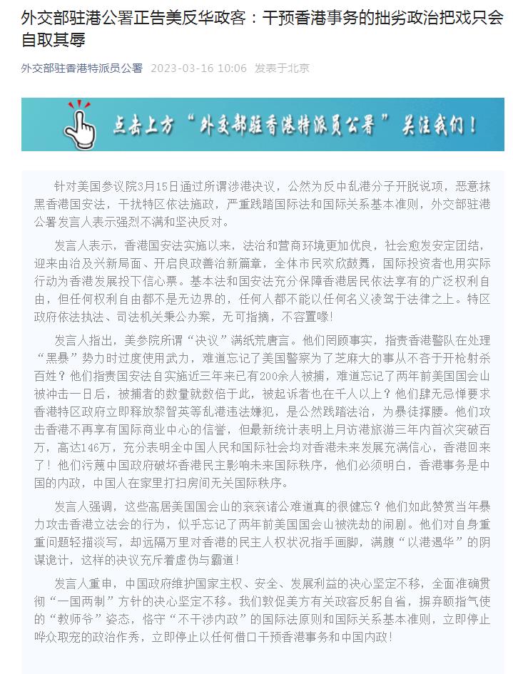 中新網(wǎng)3月16日電 據(jù)外交部駐港公署微信公眾號消息,針對美國參議院3月15日通過所謂涉港決議,公然為反中亂港分子開脫說項(xiàng),惡意抹黑香港國安法,干擾特區(qū)依法施政,嚴(yán)重踐踏國際法和國際關(guān)系基本準(zhǔn)則,外交部駐港公署發(fā)言人表示強(qiáng)烈不滿和堅(jiān)決反對。