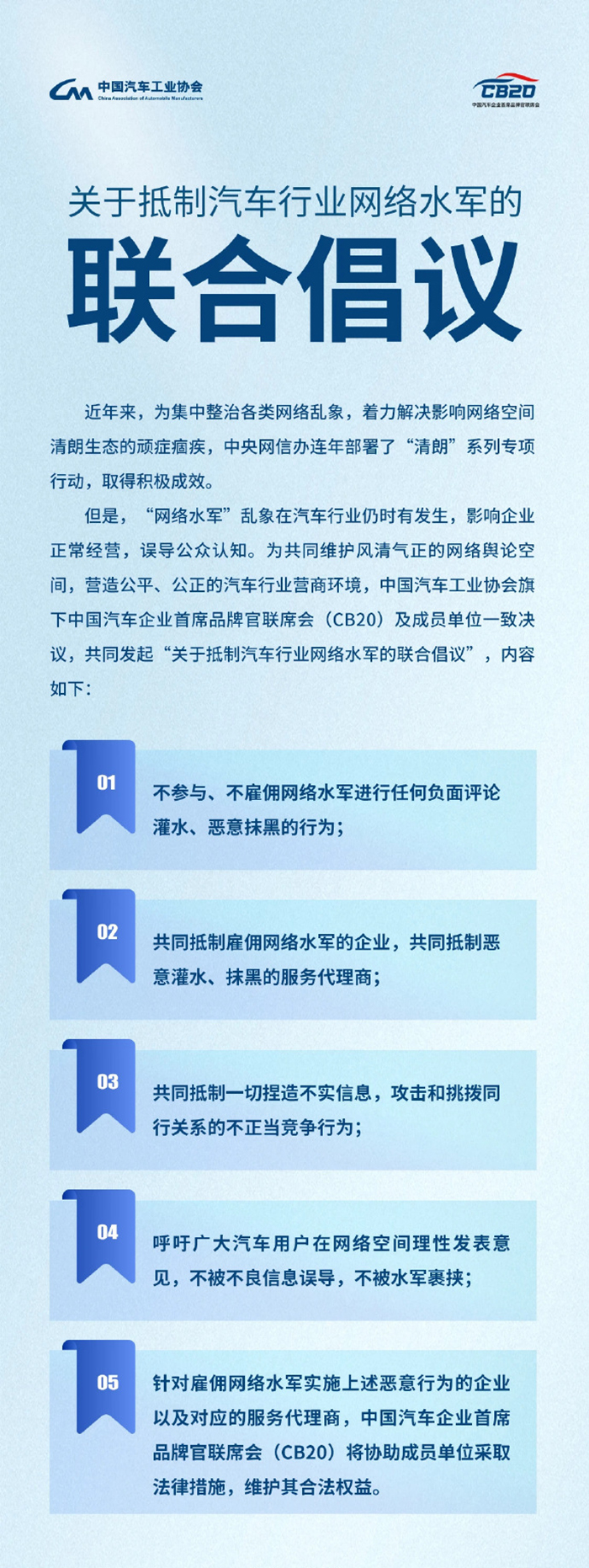 5、針對(duì)雇傭網(wǎng)絡(luò)水軍實(shí)施上述惡意行為的企業(yè)以及對(duì)應(yīng)的服務(wù)代理商,中國(guó)汽車(chē)企業(yè)首席品牌官聯(lián)席會(huì)(CB20)將協(xié)助成員單位采取法律措施,維護(hù)其合法權(quán)益。(完)
