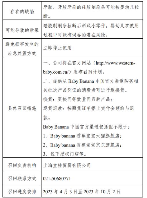 中新網(wǎng)4月3日電 據(jù)“上海市場監(jiān)管”微信公眾號(hào)3日消息,上海童榛貿(mào)易有限公司自2023年4月3日至2023年10月2日召回2010年1月至2022年8月生產(chǎn)的香蕉寶寶牌硅膠嬰兒牙膠、玉米硅膠嬰兒牙膠牙刷,共計(jì)983897件。
