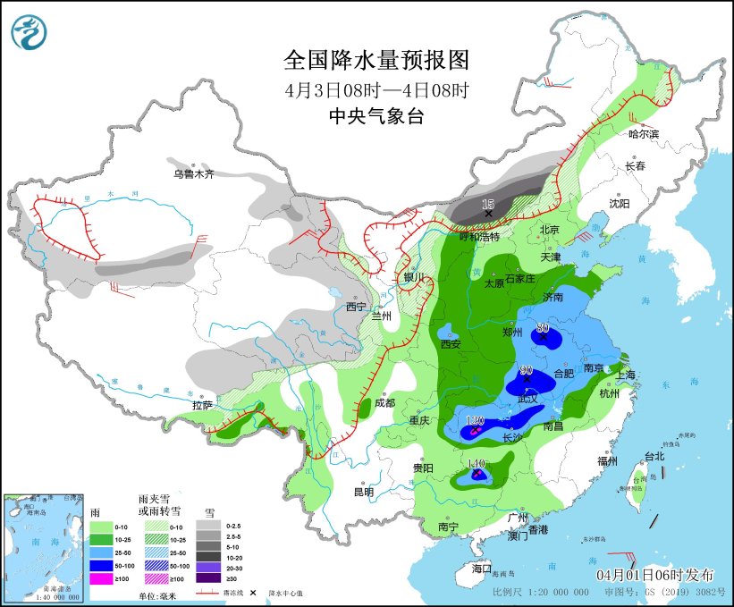 明天開始,大范圍雨雪將鋪展開來,內(nèi)蒙古河套地區(qū)、西藏東部、西北地區(qū)東部、華北南部和西部、黃淮西部、江漢、江南北部、西南地區(qū)東北部等地部分地區(qū)有中到大雨,其中,河南南部、湖北北部和南部、湖南北部等地部分地區(qū)有暴雨或大暴雨。預計本輪雨雪天氣過程主要出現(xiàn)時段在4月2日至4日。