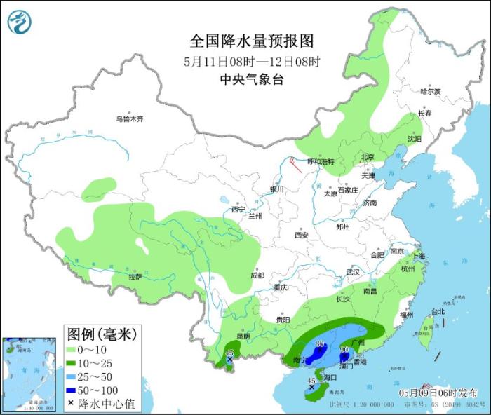 5月11日08時至12日08時,青海南部、西藏東北部、川西高原北部等地的部分地區(qū)有小到中雪或雨夾雪,局地大雪;江南南部、華南大部、云南南部等地部分地區(qū)有中到大雨,其中廣西東部、廣東中西部等地的部分地區(qū)有暴雨(50~90毫米)。內蒙古中西部、西北地區(qū)東部等地的部分地區(qū)有4~5級風。