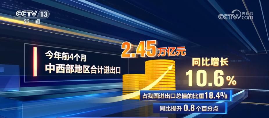 央視網(wǎng)消息:從我國外貿(mào)區(qū)域結(jié)構(gòu)來看,今年前4個月,中西部地區(qū)合計進(jìn)出口2.45萬億元,同比增長10.6%,占我國進(jìn)出口總值的比重18.4%,同比提升0.8個百分點(diǎn)。我國中西部地區(qū)進(jìn)出口快速增長,增速高出全國4.8個百分點(diǎn)。