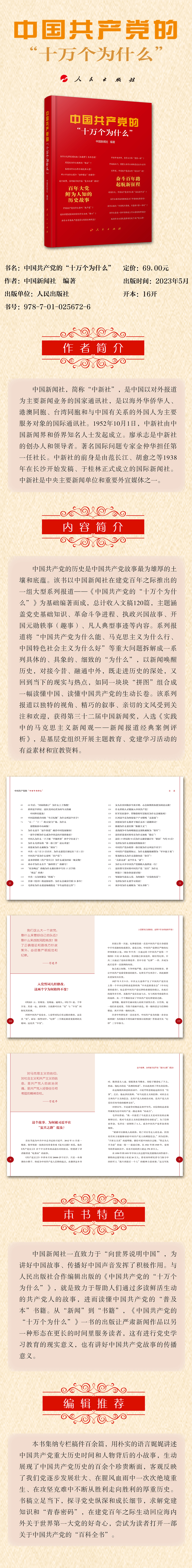 中國新聞社一直致力于“向世界說明中國”,為講好中國故事、傳播好中國聲音發(fā)揮了積極作用。與人民出版社合作編輯出版的《中國共產(chǎn)黨的“十萬個為什么”》,就是致力于幫助人們通過多讀鮮活生動的共產(chǎn)黨人的故事,進(jìn)而讀懂中國共產(chǎn)黨的“普及本”書籍。從“新聞”到“書籍”,《中國共產(chǎn)黨的“十萬個為什么”》一書的出版讓嚴(yán)肅新聞作品以另一種形態(tài)在更長的時間里服務(wù)讀者,這有進(jìn)行黨史學(xué)習(xí)教育的現(xiàn)實(shí)意義,也有講好中國共產(chǎn)黨故事的傳播意義。