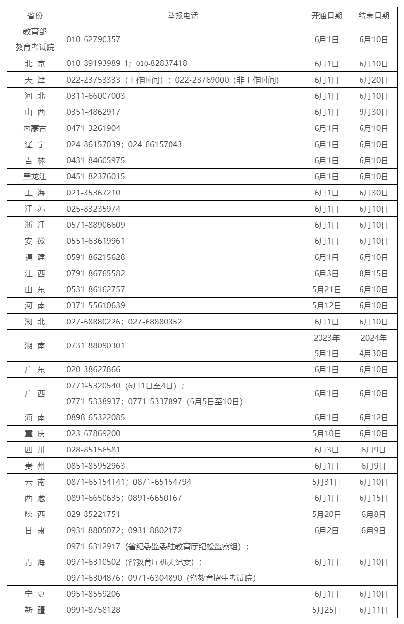 教育部和各省(區(qū)、市)開通2023年高考舉報電話