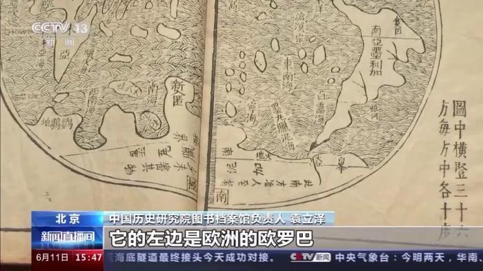 中國歷史研究院圖書檔案館負責人 袁立澤:這幅圖是16世紀末,西方第一批來華傳教士利瑪竇主持繪制的。把西方當時先進的制圖技術帶到了中國,同時他有意識地吸收了中國的制圖經(jīng)驗和理念。今天我們所熟悉的七大洲四大洋,在圖中應該說已經(jīng)標示出了六大洲和三大洋,就是亞洲的亞細亞。它的左邊是歐洲的歐羅巴,南面就是今天的非洲叫利未亞,改變了以往以歐洲為中心的繪圖方式。它是中西文明交流互鑒的一個結晶和有力見證。