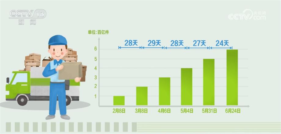 今年以來,從2月8日我國快遞業(yè)務(wù)量超100億件起,每個月快遞業(yè)務(wù)量都以百億件為增量。28天,快遞業(yè)務(wù)量從100億件到200億件(3月8日),29天達300億件(4月6日),28天從300億件到400億件(5月4日),27天達500億件(5月31日),從500億件到600億件(6月24日)只花了24天。