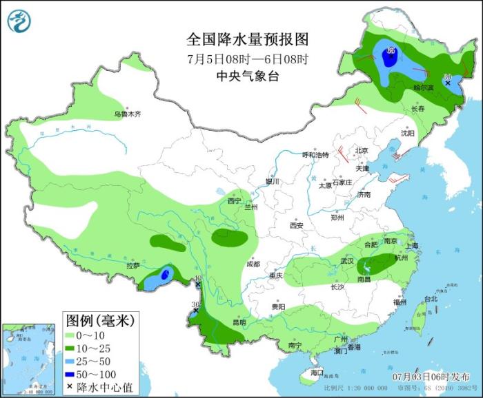 7月5日08時至6日08時,內(nèi)蒙古東北部、黑龍江、吉林北部以及江西北部、安徽南部、川西高原北部、云南西部和南部、西藏東南部等地部分地區(qū)有中到大雨,其中,內(nèi)蒙古東北部、西藏東南部等地部分地區(qū)有暴雨(50~65毫米)。內(nèi)蒙古中東部、華北北部和東部、山東半島、東北地區(qū)北部和南部等地部分地區(qū)有4~6級風(fēng)。