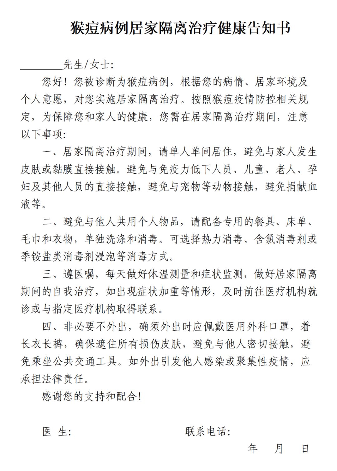 各地發(fā)現(xiàn)猴痘疑似病例和確診病例應(yīng)當(dāng)及時轉(zhuǎn)運至醫(yī)療機(jī)構(gòu)進(jìn)行隔離治療,如臨床癥狀明顯好轉(zhuǎn),病變部位已結(jié)痂,可轉(zhuǎn)為居家隔離治療,直至皮疹結(jié)痂自然脫落,解除居家隔離。對病情較輕且具備居家隔離治療條件的確診病例,經(jīng)醫(yī)療機(jī)構(gòu)與疾控機(jī)構(gòu)聯(lián)合評估后,可直接采取居家隔離治療。對于實行居家隔離治療的確診病例發(fā)放《猴痘病例居家隔離治療健康告知書》(見附件2)。確診病例居家隔離治療期間,單人單間居住,避免與家人有皮膚或黏膜直接接觸,做好被污染物品的消毒,非必要不外出,確須外出時穿長衣長褲、佩戴醫(yī)用外科口罩,避免前往人群聚集場所,避免與其他人有皮膚或黏膜直接接觸;指定醫(yī)療機(jī)構(gòu)安排專人負(fù)責(zé)上門或電話隨訪,提供健康咨詢和醫(yī)療指導(dǎo)。