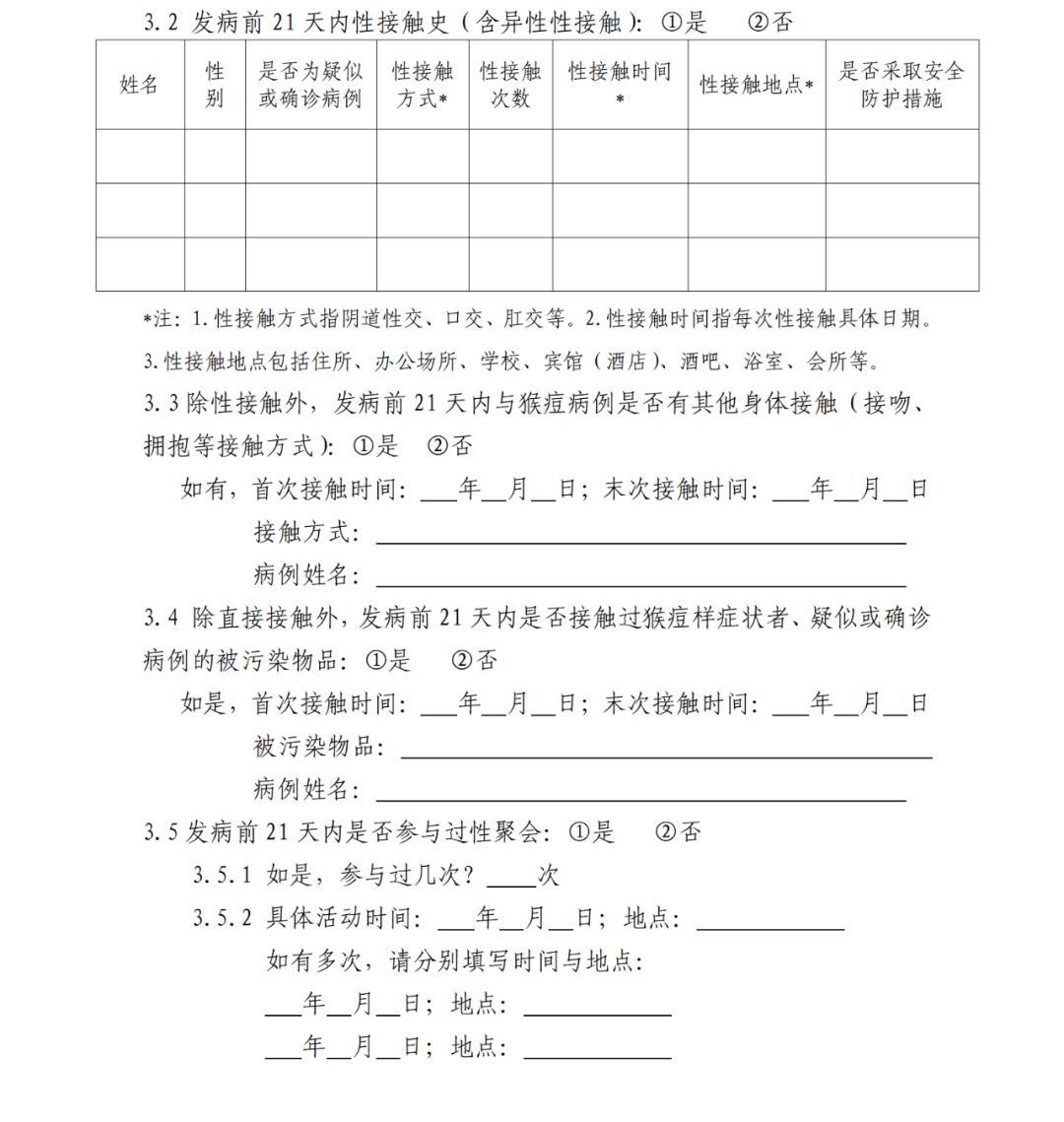 調(diào)查內(nèi)容主要包括病例基本信息、發(fā)病就診情況、臨床表現(xiàn)、轉(zhuǎn)歸及實驗室檢測;發(fā)病前21天內(nèi)與可疑感染來源的接觸史、接觸場所及接觸方式;發(fā)病后至隔離治療前的具體活動地點、與其有皮膚或黏膜直接接觸者,以及發(fā)病前4天內(nèi)與其有性接觸者。