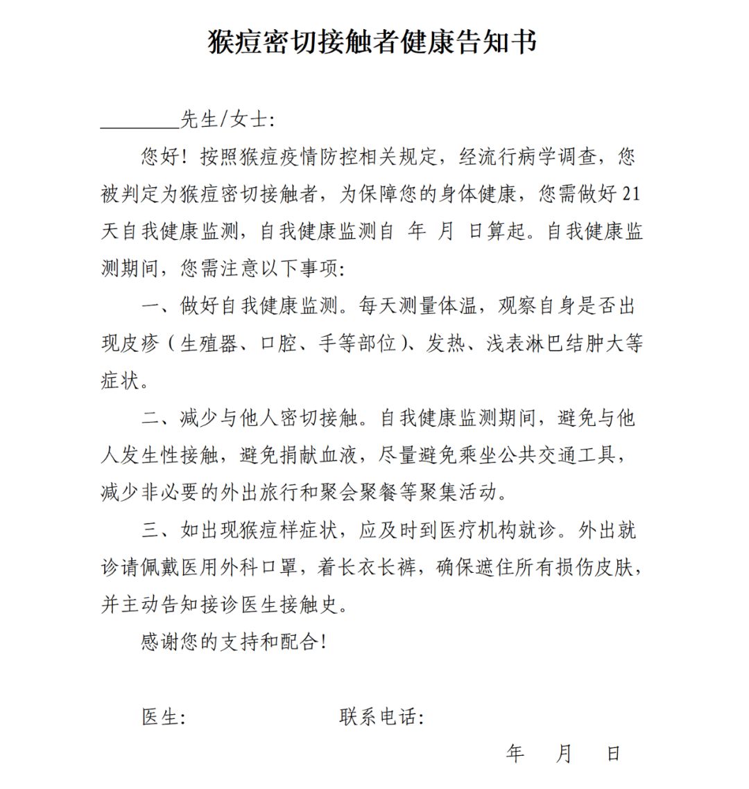 密切接觸者自我健康監(jiān)測期間可正常生活與工作,需避免與他人發(fā)生性接觸等密切接觸,避免捐獻(xiàn)血液等;堅持每天做好體溫測量和癥狀監(jiān)測,出現(xiàn)猴痘樣癥狀應(yīng)及時就診并主動報告可疑接觸史。轄區(qū)疾控機(jī)構(gòu)或基層醫(yī)療衛(wèi)生機(jī)構(gòu)應(yīng)在密切接觸者自我健康監(jiān)測第7、14、21天上門或電話對其進(jìn)行隨訪,提供咨詢指導(dǎo),發(fā)現(xiàn)異常情況及時進(jìn)行處置。