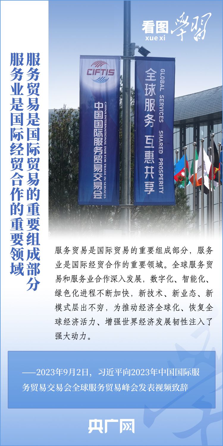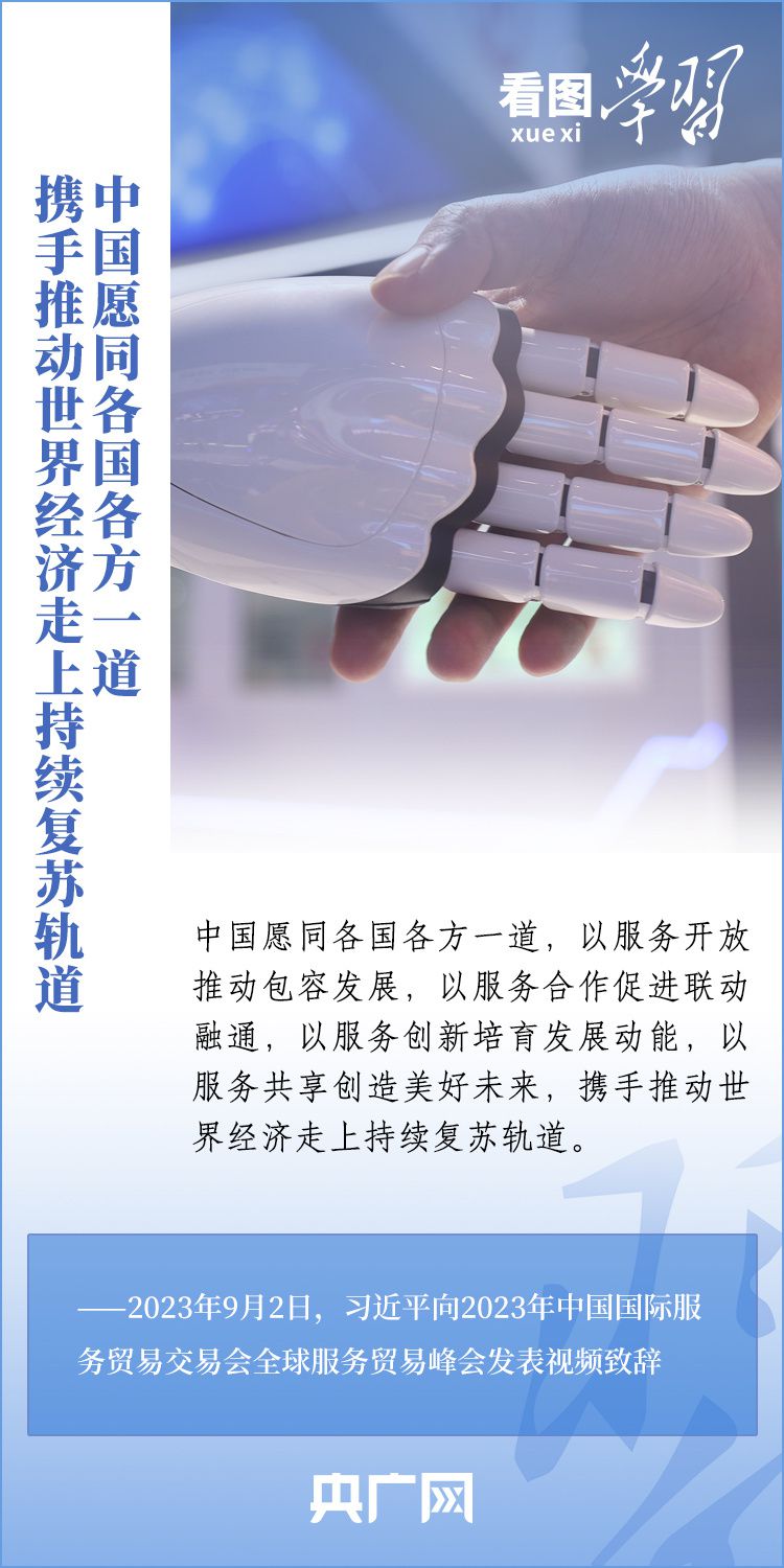 9月2日上午,以“開放引領(lǐng)發(fā)展 合作共贏未來”為主題的2023年中國國際服務(wù)貿(mào)易交易會在北京舉行。國家主席習近平向2023年中國國際服務(wù)貿(mào)易交易會全球服務(wù)貿(mào)易峰會發(fā)表視頻致辭表示,中國愿同各國各方一道,攜手推動世界經(jīng)濟走上持續(xù)復蘇軌道。一起來學習!