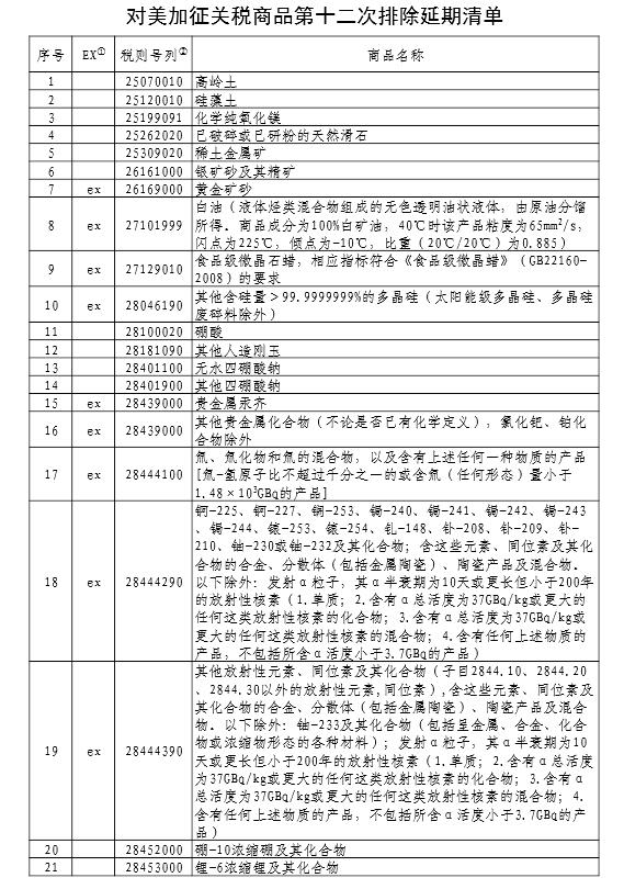 國務院關稅稅則委員會公布對美加征關稅商品第十二次排除延期清單